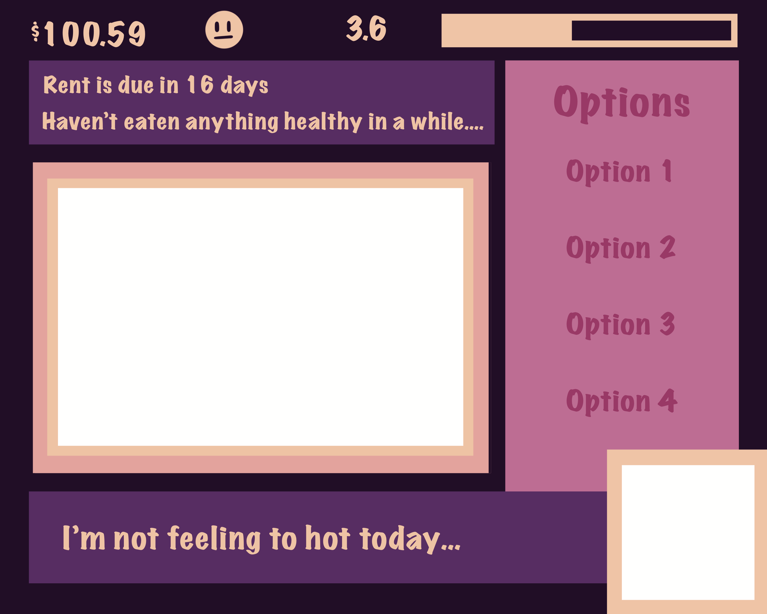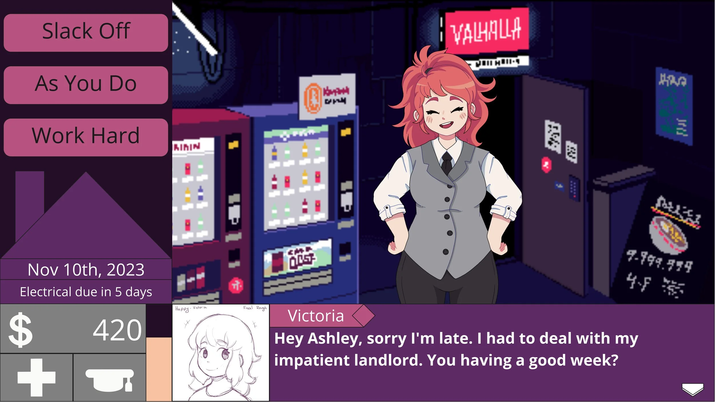 One Month at a Time is a narrative visual novel that brings awareness to the housing crisis in Ontario, Canada. Players will follow the journey of Victoria as she lives her day-to-day life working, socializing, and studying. All while balancing her savings, to have enough for rent by the end of the game. This game is filled with interesting events, interactable elements, and a riveting storyline for the player’s enjoyment.